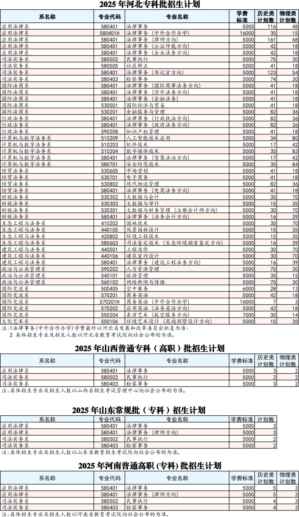 河北政法职业学院2025年普招计划