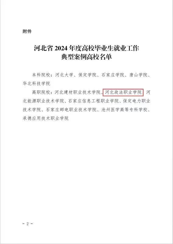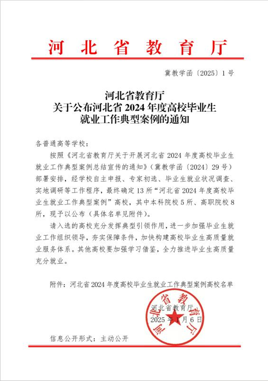 1月6日,河北省教育厅印发《关于公布河北省2024年度高校毕业生就业工作典型案例的通知》(冀教学函〔2025〕1号),我校入选“河北省2024年度高校毕业生就业工作典型案例”。
